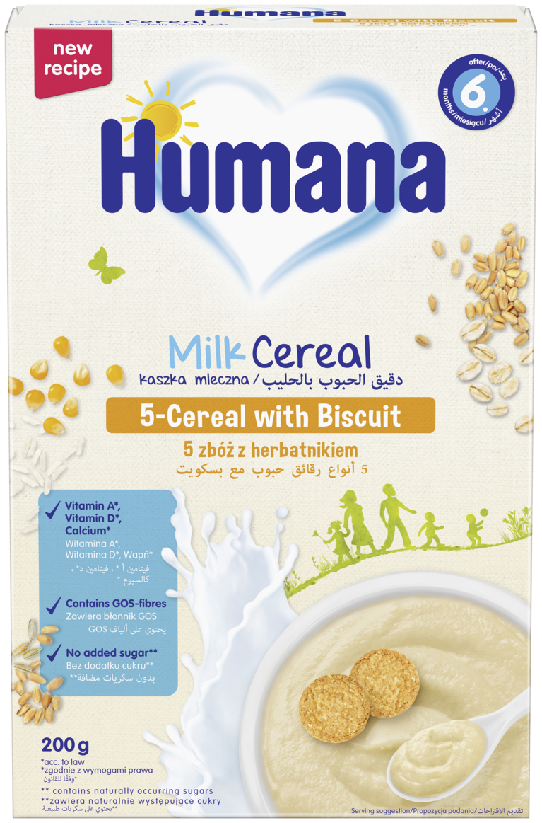 Vreme je za raznovrsnost sa ukusnim sastojcima! Uvođenje naših kašica od više vrsta žitarica vašoj bebi pruža divno iskustvo sa novim ukusima. Sa važnim vitaminima i mineralima, naša Humana mlečna kašica sa 5 vrsta žitarica i keksom obezbeđuje hranljive materije za rast vaše bebe.