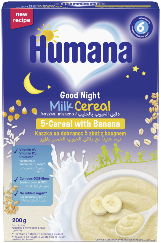 Naša Humana mlečna kašica za laku noć sa celim zrnom žita i bananom je idealna kašica za veče. Visok udeo celog zrna čini ga savršenim obrokom za miran i dobar san.