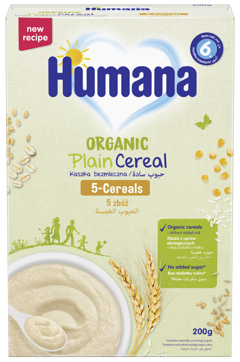 Čvrsta hrana obezbeđuje važne hranljive materije koje su potrebne za rast vaše bebe. Naša Humana organska bezmlečna kašica sa 5 vrsta žitarica sadrži samo žitarice iz organskog uzgoja i vitamin B1 (tiamin) kako je propisano zakonom za kašice za bebe.