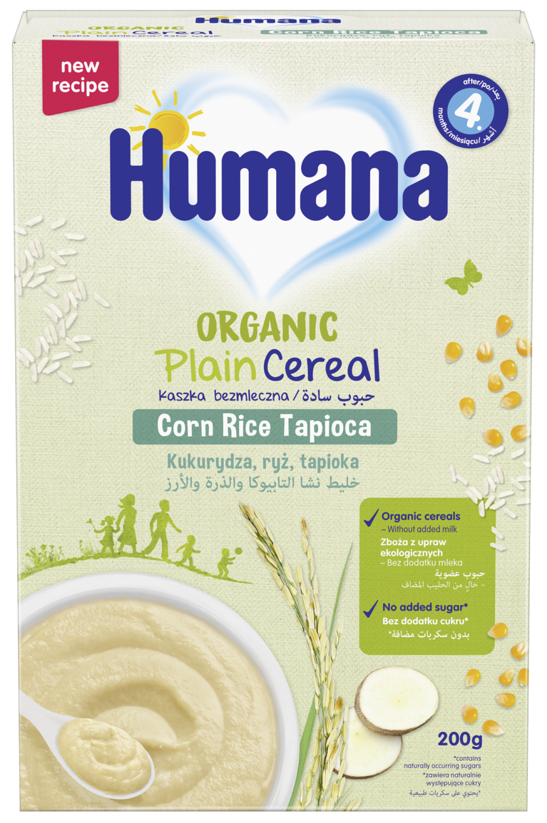 Čvrsta hrana obezbeđuje važne hranljive materije koje su potrebne za rast vaše bebe. Naša Humana organska bezmlečna kašica sa kukuruzom, pirinčem i tapiokom sadrži samo žitarice iz organskog uzgoja i vitamin B1 (tiamin) kako je propisano zakonom za kašice za bebe.